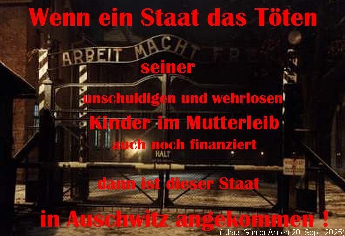 Wenn ein Staat zunächst Gesetze schafft, die ein Unrecht legitimiert bzw. straffrei stellt – auch die Tötung eines unschuldigen und wehrlosen Kindes im Mutterleib ist ein Unrecht – und diese dann auch noch als „medizinische Leistung“ des Staates kostenfrei stellt … dieser Staat befindet sich nicht „mehr auf den Weg hin nach Auschwitz“ sondern „steht bereits mitten in Auschwitz!“