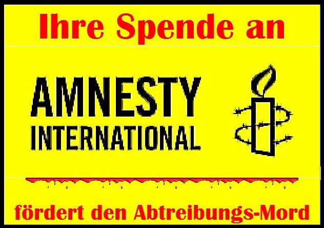 Wenn Sie auf die Internetseite dieser Organisation schauen, erkennen Sie bald, daß Amnesty in Wahrheit den ungeborenen Kindern nicht nur den Schutz versagt und die Menschenwürde abspricht, sondern weltweit den millionenfachen Massenmord an unseren ungeborenen Kindern fördert. Sie nennen dies auch noch ein Menschenrecht…. Menschenrecht zum Töten.