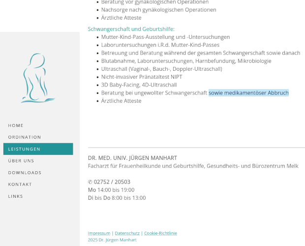 In dem bekannten katholischen niederösterreichischen Städtchen Melk hat Manhart sich eine Praxis im „Gesundheits & Bürozentrzum Melk (GBZ2) angemietet und bietet dort seit 17.10.2022 als Gynäkologe ein umfassendes Spektrum an medizinischen Dienstleistungen an.